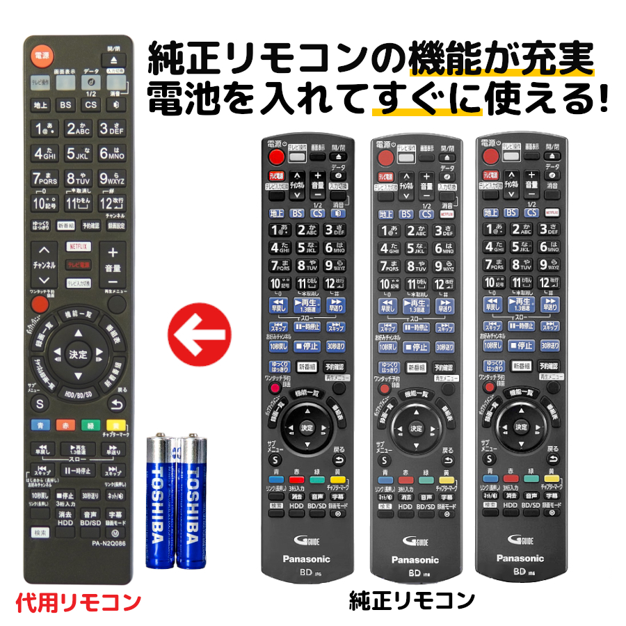 ・パナソニック用の「代用リモコン」です。 ・純正リモコンと同機能のボタンが設置されており、主な機能は全て使用できます ※テレビ、レコーダー側に機能がない場合やリモコンにボタンとして設置されていない機能は操作ができかねます。 ・設定は不要です。 -リモコンモードを変更されている方は説明書をご参照ください。 -無線方式へ変更されている方は赤外線方式への変更が必要となります。 ・汎用リモコン、マルチリモコンでは使えない機能もご使用いただけます。 ・単4アルカリ乾電池2本付きです 対応リモコン:レコーダー型番 N2QAYB001086 DMR-BRW520 DMR-BRW1020 N2QAYB001071 DMR-BRG2020 DMR-BRZ1020 N2QAYB001142 DMR-BRG2030 DMR-BRG1030 N2QAYB001087 DMR-UBZ1020 DMR-UBZ2020 N2QAYB001143 DMR-BX2030