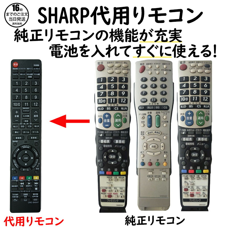 シャープ アクオス テレビ リモコン GB047WJSA GA716WJSA GA826WJSA GA661WJSA GA567WJSA GA654WJSA GA491WJSA GA514WJSA GA548WJSA GA750WJSA GA615WJSA GA226WJSA GA464WJSA GB046WJSA GA632WJSA GA765WJSA GA550WJSA など SHARP AQUOS 液晶テレビ 代用リモコン REMOSTAシャープ アクオス テレビ リモコン GB047WJSA GA716WJSA GA826WJSA GA661WJSA GA567WJSA GA654WJSA GA491WJSA GA514WJSA GA548WJSA GA750WJSA GA615WJSA5商品情報商品説明・シャープ用の「代用リモコン」です。・純正リモコンと同機能のボタンが設置されており、主な機能は全て使用できます※テレビ、レコーダー側に機能がない場合やリモコンにボタンとして設置されていない機能は操作ができかねます。・設定不要で、電池を入れればすぐに使用できます。(リモコン番号を