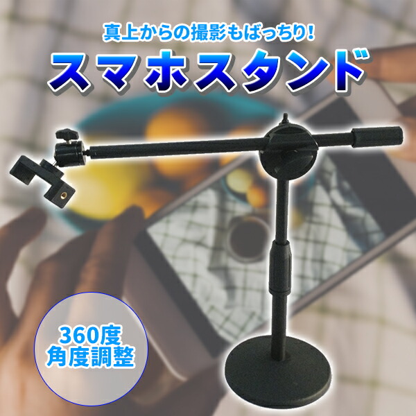 お手持ちのスマホで簡単に俯瞰撮影ができる!真上から撮影可能なスマホホルダーです。可動域がとにかく広い!上下伸縮・前後移動・360°回転と自由に角度調整可能。固定つまみを緩めると、上下に伸縮可能です。サイズ(約):150mm(ベース径)*510mm*425mm(支柱)重量(約):1.7kg対応機種:幅(約)6.0cm〜10cmのスマートフォン材質:スチール等カラー:ブラック【注意事項を予めご了承ください】●入荷時期により、若干デザインや仕様が変わる場合がございます。●輸入品のため、小傷・擦れ・汚れ・変形・ヘコミ等などが付いている場合があります。●取扱・取付説明書等は付属しておりません。●販売のみとなりますため、取扱・取付方法のお問い合わせ等は対応不可となります。●当商品を使用した事による他商品の破損・故障につきましては一切の責任を負いかねます。