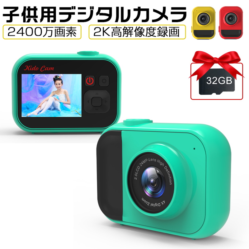 【機能豊富】この製品は写真、ビデオ、音楽の再生機能が搭載されている子供用デジタルカメラです。【簡単操作 & 子供にとって最高!】使い方はシンプルですので撮影に興味を持ち始めたお子様にピッタリ!すぐうまく利用出来ますので、写真を撮る楽しみを増やします。お子様の想像力を高めるきっかけに!ボタンを押すだけで、最高の思い出の写真が簡単に撮れます。楽しい時間、感動な瞬間などをカメラで留められます!【超軽量 & ストラップつき!】2.0インチの高解像度ディスプレイを持ちながら、本体質量はわずか85gです。環境にやさしい無毒で耐衝撃なABS + PC材料を採用し、落としても壊れにくいです。持ち運びの便利さを考えて、ストラップ付きタイプに設計しました。落下する心配が要らず、様々な場所で安心してご利用いただけます。【カラー】レッド、イエロー、グリーン【パッケージ内容】子供カメラ本体、USBケーブル、32GBメモリカード、ストラップ、日本語取扱説明書