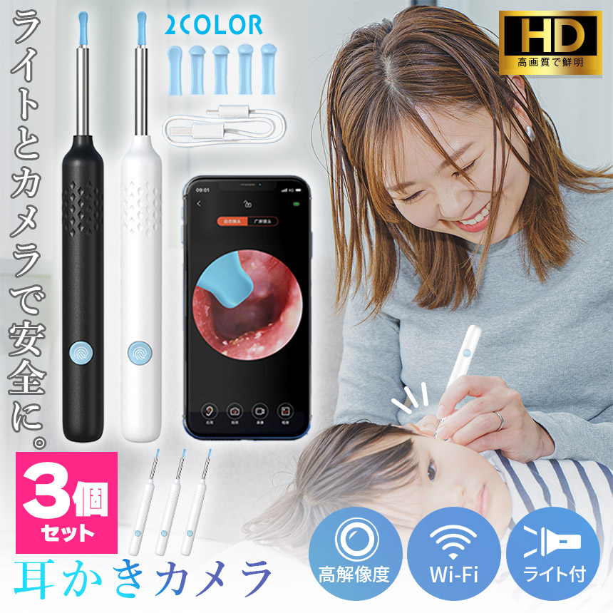 ■耳かき カメラ 耳鏡 3個セット イヤースコープ WIFI接続 耳垢 耳掃除 LEDライト 超小型レンズ 介護用 子供 高齢者 アプリ付き カメラ付き