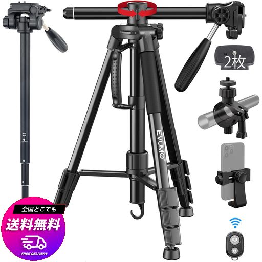 ■EVUMO HF3 カメラ 三脚 一脚、167CM 俯瞰撮影三脚リモコン付きそしてスマホホルダー、3WAY雲台 コンパクト携帯軽量水平3脚 一眼レフ、ビ