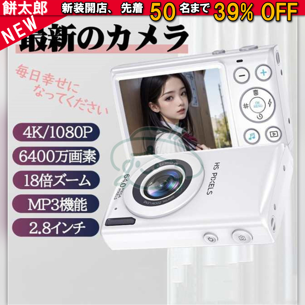 デジタルカメラ デジカメ 6400万画素 4K 動画撮影 2.8インチ 18倍ズーム 高画質 AF機能 自撮り スマホ転送 手振れ補正 美顔 フィルター 初心者