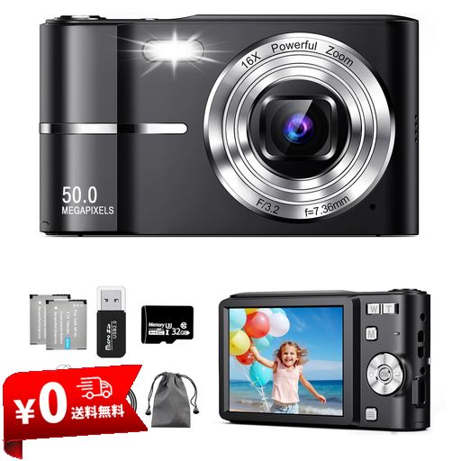 ■デジカメ【FHD動画撮影、5000万画素】デジタルカメラ 32GB MICRO SDカード付き AFオートフォーカス コンパクトカメラ 2.7インチの大画面