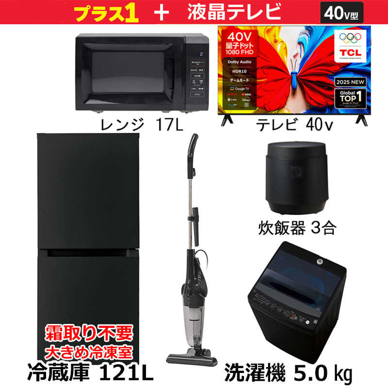 ■新生活家電セット5点 ブラック 黒 【プラス 40V型液晶テレビ付】 冷蔵庫 / 洗濯機 / 液晶テレビ / 電子レンジ / 掃除機 / 炊飯器[一
