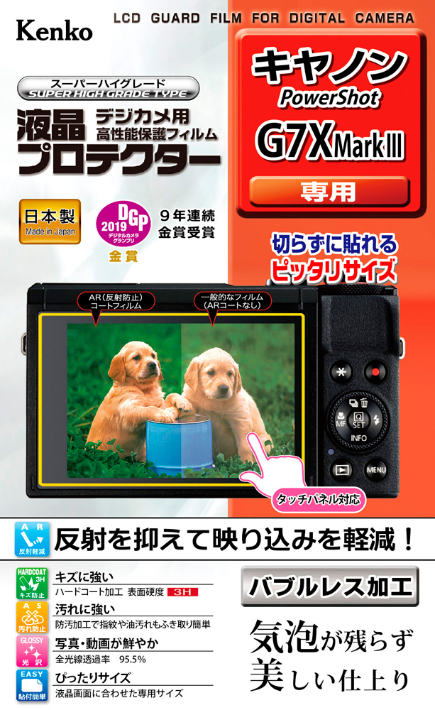 液晶画面をキズ・汚れから守る。 ●サラサラつやつやすべり性UPフッ素の力で防指紋性、撥水性がアップ。サラサラ・つやつやで操作感がさらに快適になりました。●新開発バブルレス加工 気泡が残らず美しい仕上がり伸縮性・弾力性に優れた厚手の特殊なシリコン層が、貼る時の気泡を入りにくくし、さらに残った気泡が時間の経過とともに分散され見えなくなります。※気泡のサイズによっては気泡が消えない場合があります。●反射を抑えて映り込みを軽減真空蒸着技術による特殊なAR(アンチリフレクション)加工が光の映り込みを軽減し、高い視認性を実現します。b>●画像鮮やか光沢仕様全光線透過率95.5%を実現した高光沢フィルムが優れた透明感を発揮。写真・動画をきれいに映し出します。●キズに強いハードコート加工クラス最高水準(鉛筆硬度3H)を実現したハードコート加工がキズから液晶画面を守ります。●汚れに強い防汚加工で指紋や油汚れが簡単に拭き取れます。●クリーニングシート付き貼り付け前に液晶モニターを拭けるクリーニングシート付き。/カメラ・ビデオカメラ/カメラアクセサリー/液晶保護フィルム・プロテクター/ケンコー/4961607736203/コジマ/kojima/通販/通信販売/調理家電/生活家電/家電/キッチン家電/ネットショップ
