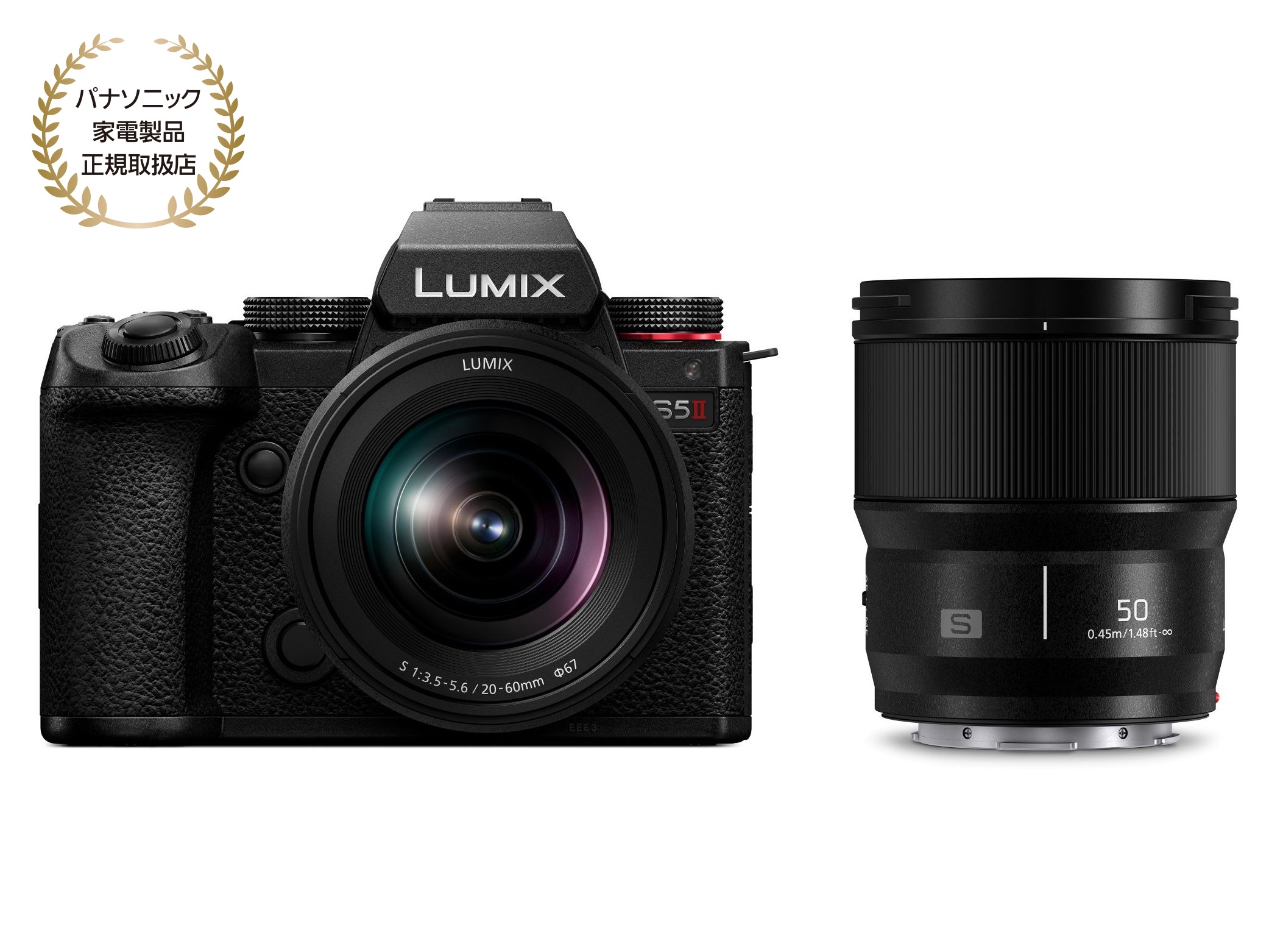 高い描写性能とLUMIX初の像面位相差AFの両立を実現オールラウンドに活躍する新世代フルサイズミラーレス一眼カメラ【主な仕様】撮像素子:35mmフルサイズCMOSセンサー有効画素数:2420万画素 マウント:Lマウント撮影感度(ISO感度):50〜204800連写撮影:最高約9コマ/秒(電子シャッター時:最高約30コマ/秒)バッテリー:DMW-BLK22記録メディア:SD/SDHC/SDXCメモリーカード(UHS-I/UHS-II/UHS Speed class 3 / UHS-II Video Speed Class 90 対応)サイズ(W×H×D):約(幅)134.3 x (高)102.3x (奥)90.1mm 本体重量:約740g(本体、バッテリー、SDメモリーカード1枚含む) 液晶サイズ:3.0型 静電容量方式タッチパネル 約184万ドット 【付属レンズ】LUMIX S 20-60mm F3.5-5.6(S-R2060)LUMIX S 50mm F1.8(S-S50)【付属品】ボディキャップ、ホットシューカバー、バッテリーグリップ端子カバー、ショルダーストラップ、バッテリーパッ