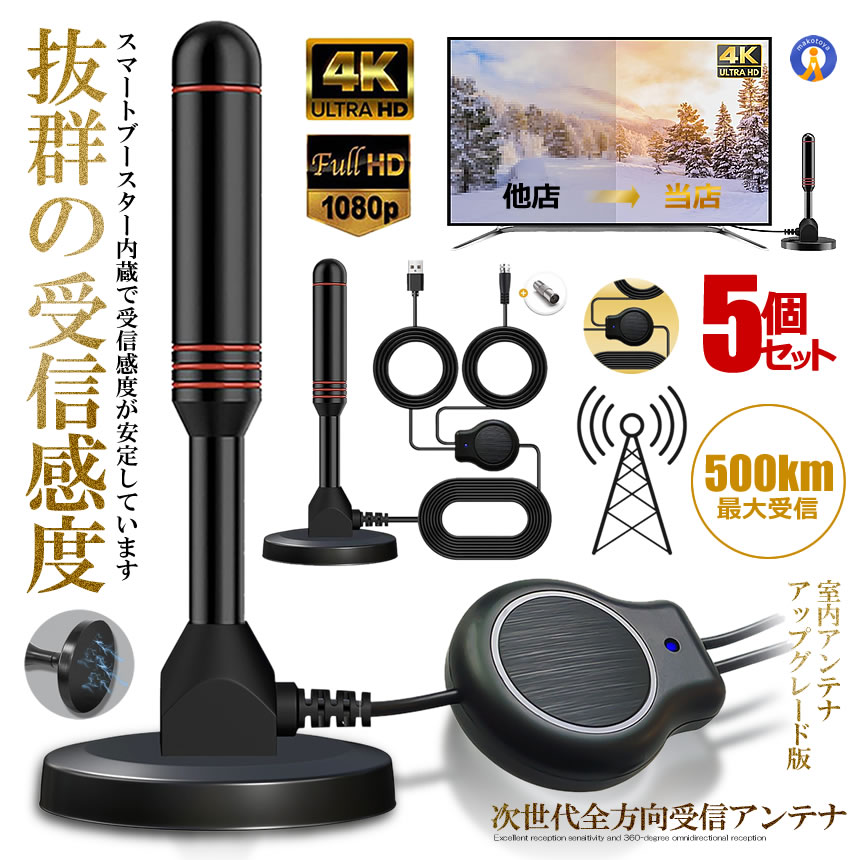 ■5個セット 室内アンテナ テレビ TV 最強 テレビアンテナ 地デジアンテナ 地デジ 信号 ブースター内蔵 4K HD TV KURAANTE