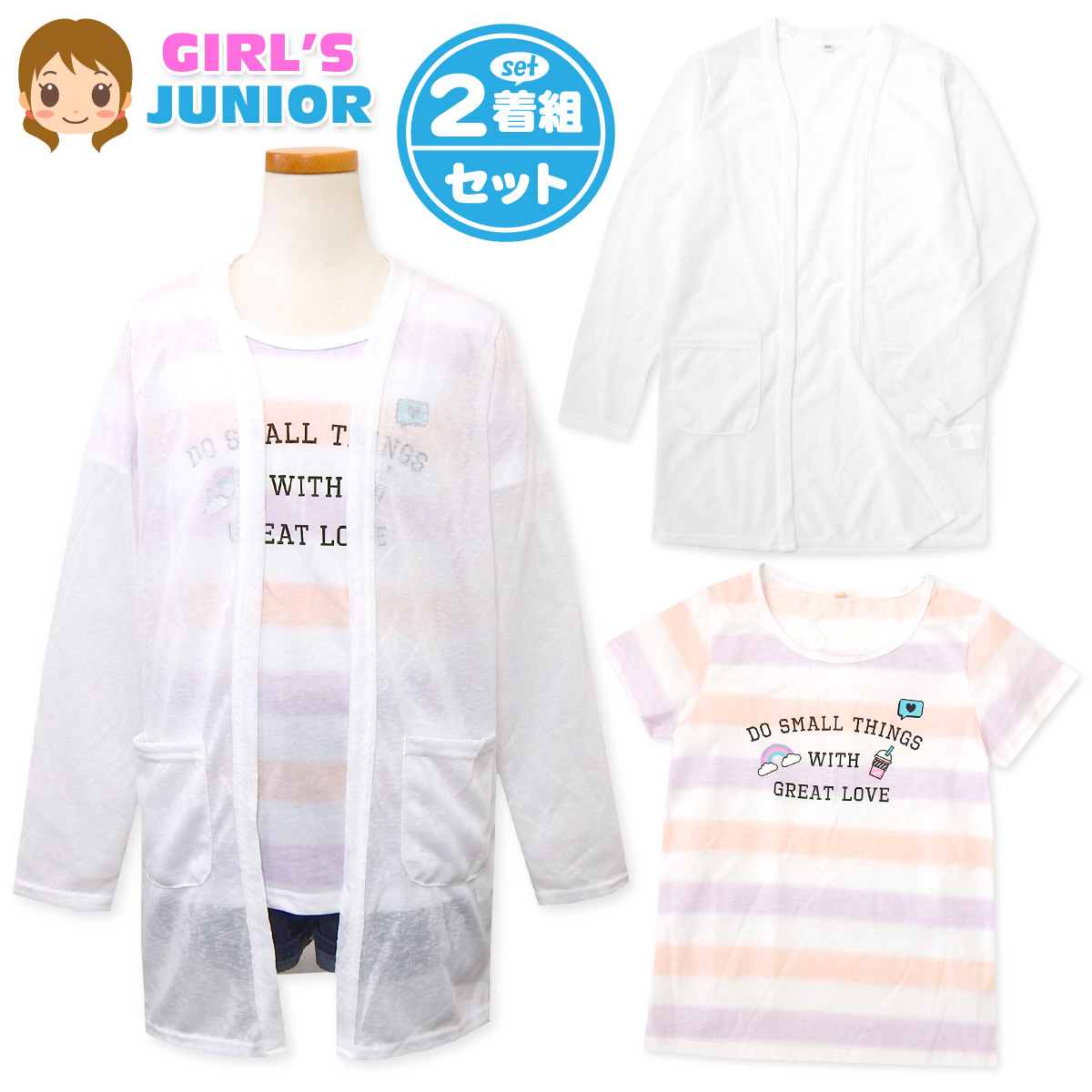■【送料無料】女児 ジュニア 2点セット コンポ 長袖 梨地 カーディガン 半袖 天竺 Tシャツ ボーダー ロゴプリント 子供服 女の子 140cm 15