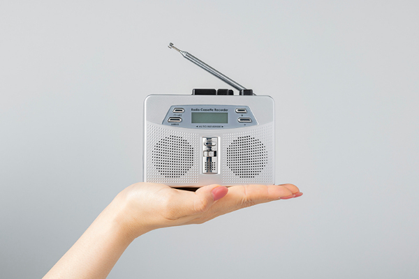 ダブルスピーカー搭載!携帯用の小型ラジカセ!手のひらサイズなのに2スピーカーの高音質&簡単操作の懐かしのラジカセ!懐かしのテープ再生はオートリバースで、ラジオはAMが入りにくい時に対応するワイドFMまで搭載した最新モデル。時計やアラーム機能、録音もできる充実っぷり。防災用に備えておくのもおすすめです。ベルトクリップ付きなので散歩時や両手が塞がっていても大丈夫!