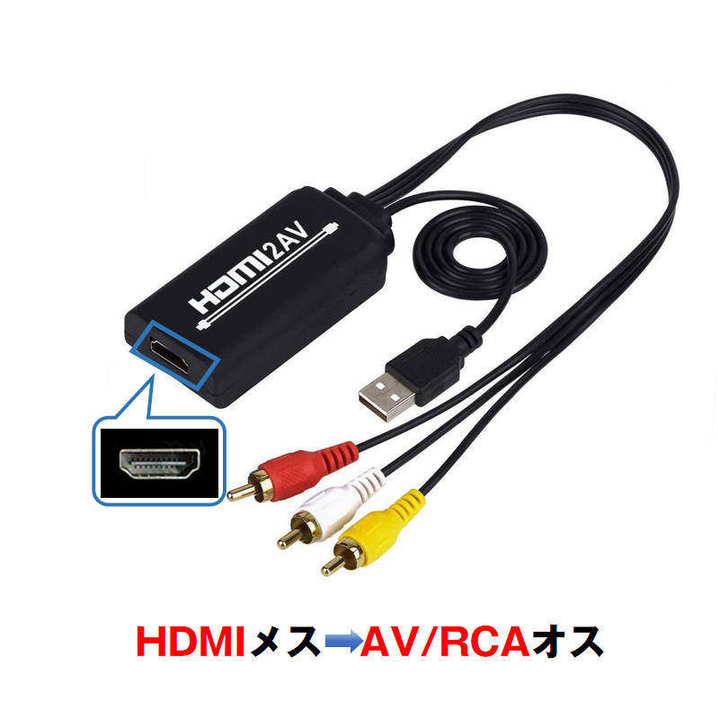 HDMI メスto RCAオス変換ケーブル です。HDMI出力のデジタル映像をアナログテレビ、ディスプレイ、モニター、カーナビ、レコーダーなどに転送するアイテムです。HDMI出力機器、例えばPC、タブレット、ゲーム機、クロームキャスト、Fire TVなどに接続することができます。希少な挿し込み型で、出力機器のHDMI端子を本商品に挿せば直ぐに使えます。ドライバー不要、設定不要商品名: HDMI メスto RCAオス変換ケーブル対応解像度:1080P@60Hz長さ:約1.3mデータ入力インターフェース:HDMIポートデータ出力インターフェース:黄白赤RCA端子電力入力:USB給電、5V1Aの充電アダプター別途必要ご注意:HDMI→RCAの変換はOK、RCA→HDMIの変換はNG。逆方向(RCA → HDMI)にはご使用できません。AV(RCA)→HDMIの変換アダプターも取り扱っておりますので、弊店の関連商品ページにて購入可能です。3D映像信号非対応。 PAL/NTSC方式に対応。安心保証について:納品後一週間以内は返品受付可能です。お気軽にご相談ください。