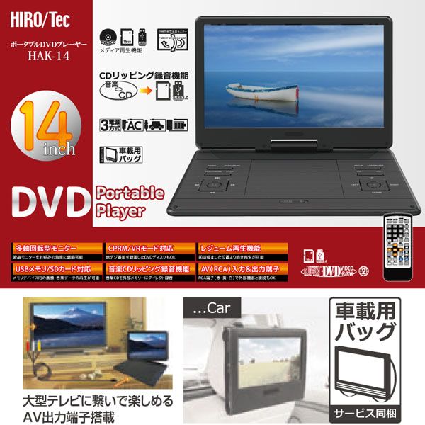 HIRO/Tec ポータブルDVDプレーヤー 14インチ 多軸回転型モニター HAK-14 HIRO Tec DVDプレーヤー DVDプレイヤー DVD CD ポータブル 映画 ドラマ スポーツ 音楽 再生 3電源 多軸回転 レジューム再生 USB SDカード 14inch 14型 車 車載 移動 持ち運び 外出先 旅行 ドライブ 出張 学習 勉強4562350986916家電 生活家電 映像機器 オーディオ機器 日用品 生活雑貨 日用雑貨 雑貨 生活506588500