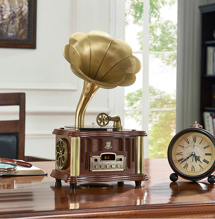 ■天然木材 蓄音機 純銅ホーン 工芸品 レトロなマルチ ヴィンテージ レコードプレーヤー Bluetooth4.2 ミニスピーカー USB/FM ラジオ アン