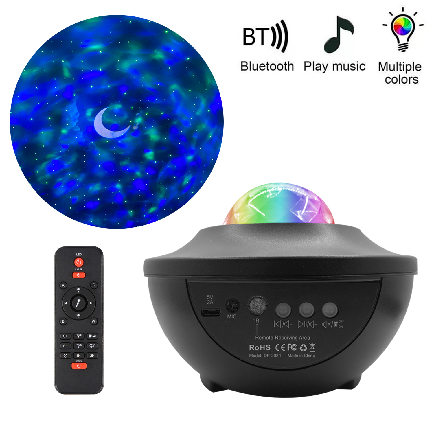 -4つの落ち着いた色(青、赤、緑、白)は、無地またはカラフルな海の波の照明効果を投影できます。 -10の照明モードを作成します-リモートとタイマー、音楽は音楽を介して照明をアクティブにすることができます(内蔵ミニスピーカーはBluetooth経由でスマートフォンまたはタブレットに接続します);