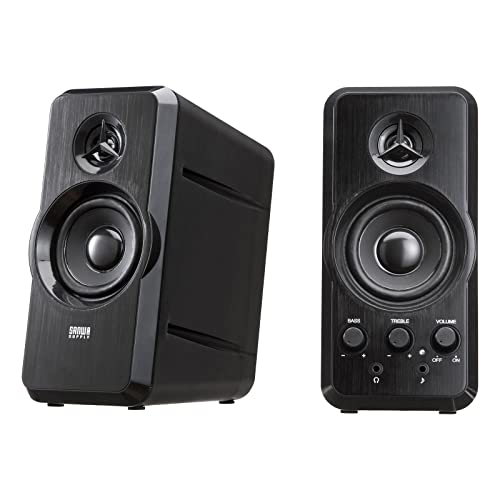 ブラック/9奥行きx15.9幅x19.1高さcm/MM-SPL6BKN ・パッケージ個数:1 ・実用最大出力20Wのハイパワーと奥行きのあるハウジングで広がりのある音を再現できる2chマルチメディアスピーカーです。 ・高音再生専用のツィーターを搭載し、可聴帯域から超高音帯域まで質感高い高品位サウンドを鮮やかに再現します。 ・深みのある低音域から自然で安定した中音域を再生する2.5インチのウーファーユニットを搭載しています。 ・操作性の高い大型スイッチ類を採用しており、BASS(低音)、TREBLE(高音)、ボリュームの調整が可能で、視聴環境や音源により細かく調整ができます。 ・右スピーカーの前面に外部入力(AUX)ジャックを搭載し、メイン音声はパソコン側に接続したまま、スマートフォンやMP3プレーヤーを接続し手軽に出力することができます。