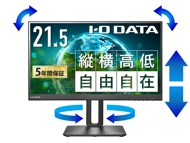 輝度:250cd/m2/応答速度:4ms/最大消費電力:27W/■見やすい位置に調整できるフリースタイルスタンド搭載、100Hz対応の21.5型ワイド液晶ディスプレイです。高さや角度、画面の向きを簡単に変えられるためマルチディスプレイに最適です。3辺フレームレスパネルを採用。「Display Port」「HDMI」の入力端子を搭載。■一般的な60Hzのディスプレイより、1.6倍高速に映像が書き換わります。画面のスクロールもスムーズになるため、WebサイトやPDFの資料などの閲覧でも残像感が軽減され、視認性が向上します。また、激しい動きの映像でもなめらかに楽しめます。■「フリースタイルスタンド」を採用!見やすい位置に高さや角度を調整することで、目や肩の疲れやストレートネック対策の一つとしても効果的です。■パネルとフレーム(枠)による段差がないフラットなフレームレスパネルを採用しました。約3.2mmの極細フレームですっきりした印象を与え、マルチディスプレイにもオススメです。スタイリッシュなデザインの液晶ディスプレイは、オフィスにマッチします。