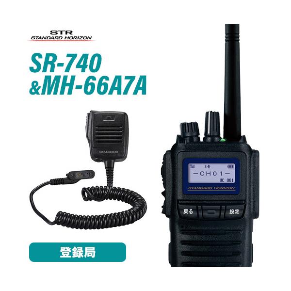 メーカー:スタンダードホライゾン品名:デジタル簡易無線登録局型番:SR740使用周波数:登録局デジタルチャンネル(6.25k Hz間隔、82波)351.03125MHz〜351.10000MHz、351.20000MHz〜351.63125MHz上空用チャンネル(6.25k Hz間隔、15波)351.10625MHz〜351.19375MHz(モニターのみ可)商品構成:SR740本体/スタビーアンテナSRA-12FS/ベルトクリップSHB-21/薄型リチウムイオンバッテリーSBR-33LI/急速充電器セットSAD-3418B/無線局登録申請書/無線局登録申請の手引きメーカー:スタンダード品名:防水型スピーカーマイク型番:MH-66A7Aマイク部分のサイズ:高さ71mm×横幅57mm×奥行30.5mm3.5φイヤホンジャック装備/マイク背面にクリップを標準装備/IPX7(防浸型)工場や屋外での使用におすすめこちらの無線機は簡易無線登録局です。ご使用いただくには電波法に基づく総合通信局への登録申請手続きが必要です。当店窓口では申請代行手続きが行えませんので、お客様のほうで手続きをお願いいたしま