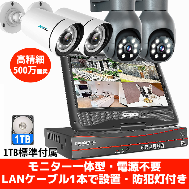 防犯カメラセット poe給電 1TBHDD内蔵 防犯カメラのポイントを紹介します。 ・500万画素対応10インチ液晶モニタ一体型 ・防犯カメラは1920Pの超高解像度で、500万画素となっており、IR-CUT機能も搭載しています。防犯カメラは4台が付属しております。 ・常時録画、人体検知、自動追跡など、様々な録画モードがございます。 ・最新のP2P技術を採用しており、防犯カメラにはマイクとスピーカーが内蔵されております。 ・防犯カメラ赤外線暗視モードと防犯灯夜間カラー撮影モードがついております。 ・設置は簡単で、電源工事の配線工事は不要です。 ・遠隔監視はパソコンやススマホから可能です。 ・防水防塵性能は高性能なIP66規格で、屋外で安心して使用することができます。 ・ランケーブルで映像送信のため、画像が安定します。 コミコミセットとなります。 ・モニター付きNVR、1TBHDDは標準装備として、内蔵されております。 ・500万画素高精細防犯カメラ4台 ・防犯カメラ用のLANケーブル4本(20m 2本、 30m 2本)