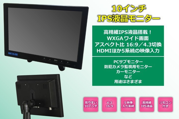 10インチIPS液晶モニター採用、コンパクトサイズモニター!アスペクト比は16:9と4:3に変更できます!USB入力ポート+メディアプレーヤー搭載。USBメモリーの動画や画像をそのまま再生!BNC端子装備。防犯カメラやHDDレコーダーにも接続可能。HDMI端子、VGA端子付パソコンのサブーモニターにもお勧め!●液晶:10.1インチ高輝度液晶●色:ブラック●液晶比率:16:9●液晶サイズ:約216.96mm*135.6mm●解像度:1280*800;●液晶:IPS高輝度タイプ●可視角度:オール対応●液晶回転:対応●明るさ:420cd/m2;●コントライス:500:1;●入力端子:VGA/AV/BNC/HDMI/USB スピーカー内臓 ●適用温度:-20℃-60℃●カバー材質:ABS●音声:モノラル式●電源DC12V MAX 2.0A●本体サイズ:約246mm*170mm*35mm●システム言語:英語●付属品:簡易マニュアル、AVケーブル、リモコン、スタンド、シガーアダプター