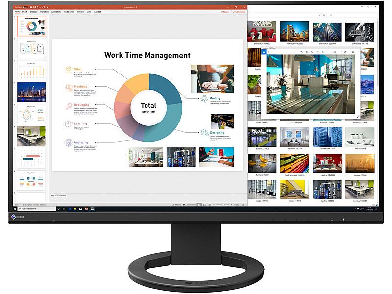 輝度:350cd/m2/応答速度:5ms最大消費電力:67W/3辺フレームレスデザイン、環境規格のEPEAT Silverに対応し、さらに内部基板と外装プラスチックのハロゲンフリー化を実現