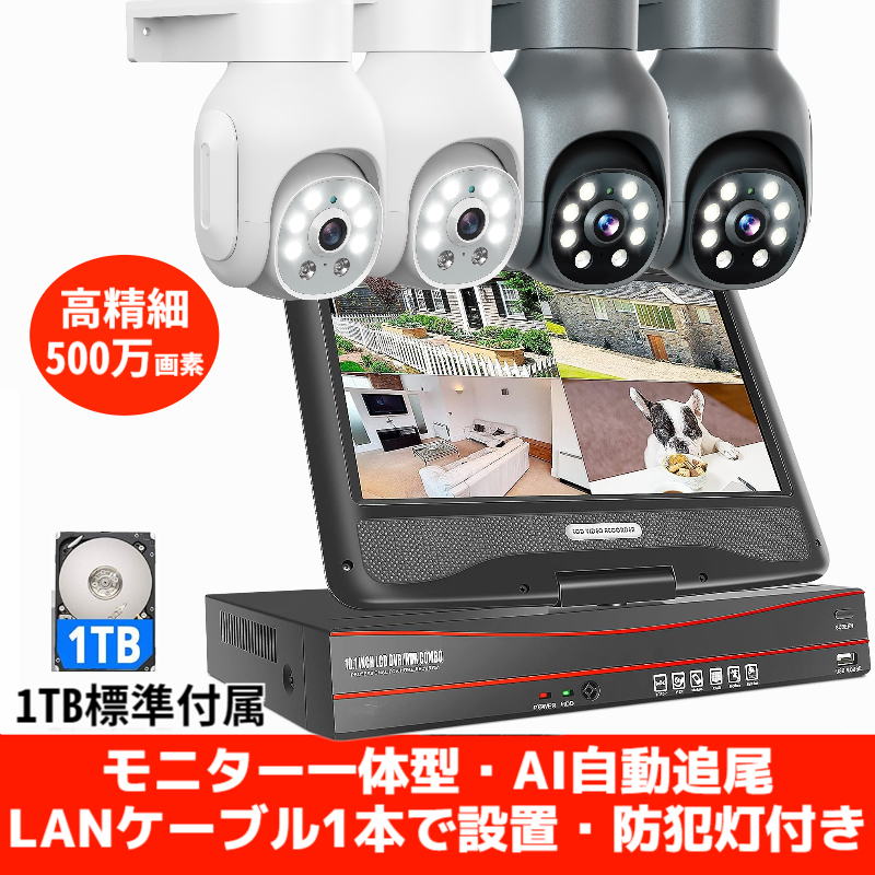 防犯カメラセット poe給電 1TBHDD内蔵 防犯カメラのポイントを紹介します。 ・500万画素対応10インチ液晶モニタ一体型 ・防犯カメラは1920Pの超高解像度で、500万画素となっており、IR-CUT機能も搭載しています。防犯カメラは4台が付属しております。 ・常時録画、人体検知、自動追跡など、様々な録画モードがございます。 ・最新のP2P技術を採用しており、防犯カメラにはマイクとスピーカーが内蔵されております。 ・防犯カメラ赤外線暗視モードと防犯灯夜間カラー撮影モードがついております。 ・設置は簡単で、電源工事の配線工事は不要です。 ・遠隔監視はパソコンやススマホから可能です。 ・防水防塵性能は高性能なIP66規格で、屋外で安心して使用することができます。 ・ランケーブルで映像送信のため、画像が安定します。 コミコミセットとなります。 ・モニター付きNVR、1TBHDDは標準装備として、内蔵されております。 ・500万画素高精細防犯カメラ4台 ・防犯カメラ用のLANケーブル4本(20m 2本、 30m 2本)