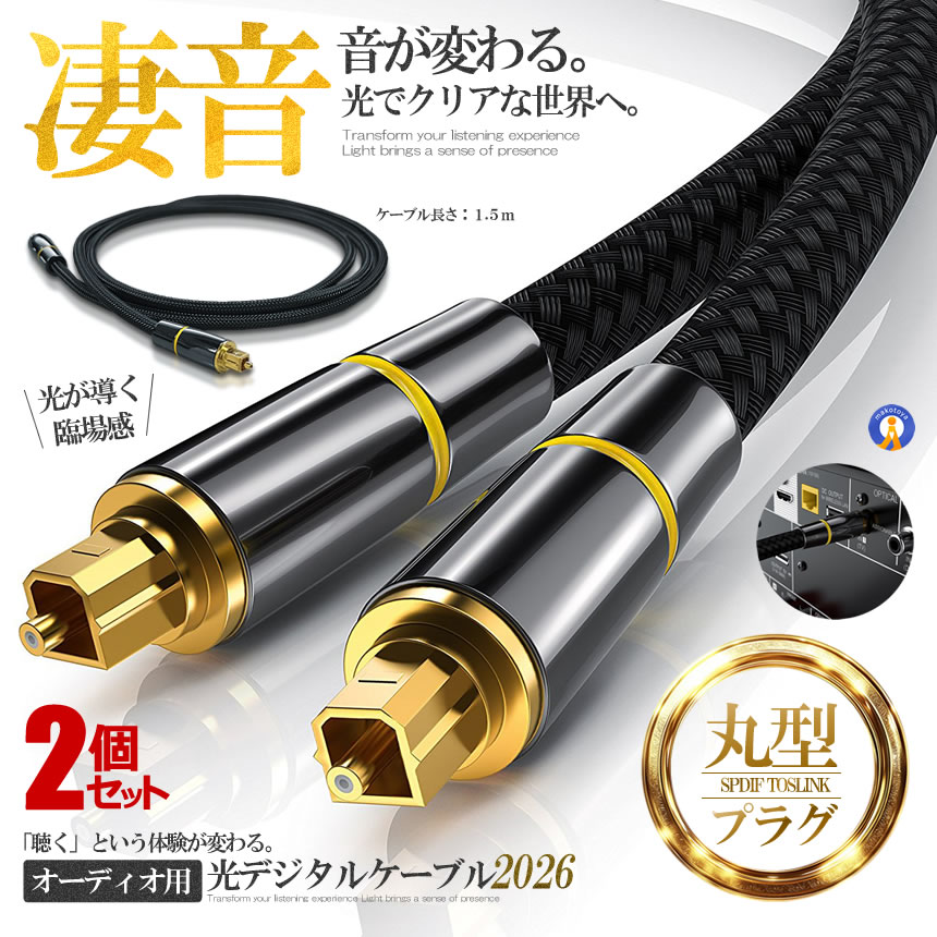 ●24金メッキ 光デジタルオーディオケーブルの端子部が改良型で24金メッキ処理を施したプラグ部により電磁波などの外来ノイズの影響を受けにくくサビなどによる画質・音質の劣化を防ぎます。●防塵保護キャップ付保護キャップが付いていますのでキズやホコリからケーブル端子を守ります。●スーパー互換性ホームシアター、スピーカー、テレビ、PS 4Xbox、VD/CDプレーヤー、ブルーレイプレーヤーゲーム機に最適です。●標準とハイビジョン対応でTospink(S/PDIF、光学)ポートがあります。完全な非圧縮PCMオーディオ、圧縮5.1から7.1までのサラウンドサウンドシステムはDobiデジタル拡張版、DTS-HD高解像度とLPCMを含む。●高耐久ナイロンケーブル内部導体にも保護線を内蔵しており。外部「TPE線材 → ナイロン被覆」の二重シールド処理が施され耐久性・柔軟性ともに優れています