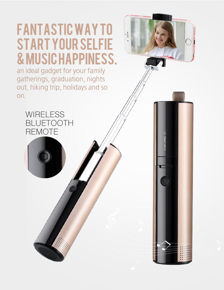 特徴 1、ポータブルデザイン:散歩、ハイキング、公園でちょっと休みたいときなど、お友達と音楽共有できます。 2、大容量バッテリー内蔵、映画5本分の音声出力可能。 3、MP3対応、曲内蔵したマイクロSD(TF)カードを、当スピーカーにセットし、再生可能です。 4、優れた音質:ステレオ プレイバックモード持っており、ライブコンサートにいるような錯覚をもたらしてくれます。 5、自撮り棒内蔵、延長棒手で伸ばし、スマホをセットして、リモートで自撮りできます。旅行などに大変便利です。 ペアリング方法: 1、スピーカーの底部、電源ボタンを3秒長押しし、電源ON、ペアリング開始 2、スマートフォンまたはタブレット本体設定→BluetoothをONにし、自動周辺機器検索行います。 3、「Selfie Speaker」の項目が一覧に出てきましたら、それをタップし、「接続済み」になれば、設定完了