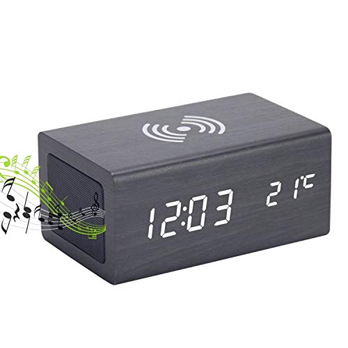 ■めざまし時計 おしゃれ スピーカー 温度計付き スマホ充電機能 多機能時計 アラーム時計 スマホワイヤレス充電 木目 インデリアオブジェ