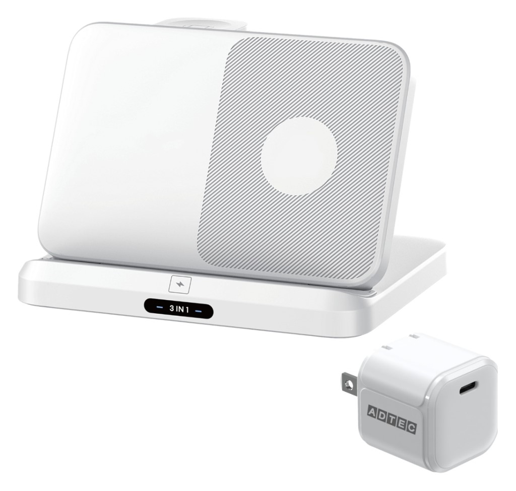 ■ADTEC アドテック 卓上 ワイヤレス充電スタンド 3in1 スマホ・イヤホン・ウォッチ&PD充電器 33Wセット AWPD-V015WEW/AS-w33W