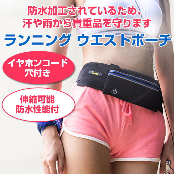 ■防水 ランニング ウエストポーチ イヤホン コード穴付き 伸縮可能 調節可能ベルト バック スマホ 音楽 DFS-POCKET-1D