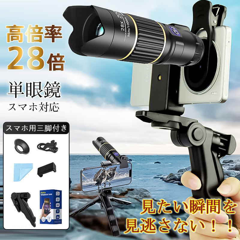 ■単眼鏡 望遠鏡 スマホカメラレンズ 高倍率 28倍 スマホ 望遠レンズ クリップ式 コンサート 多機能 三脚付属 軽量 簡単装着