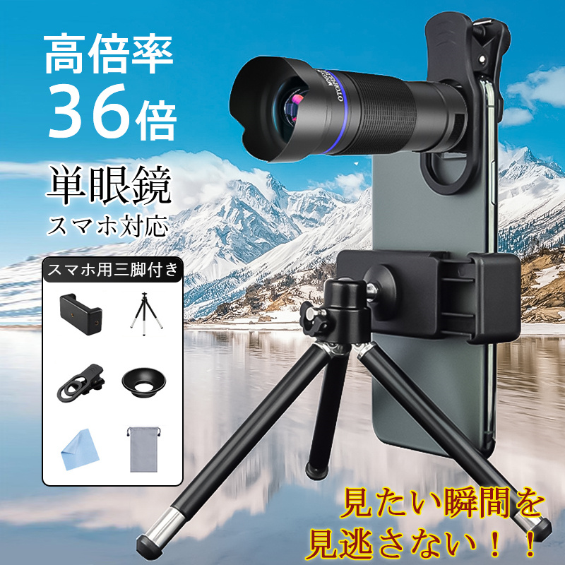 ■単眼鏡 望遠鏡 高倍率 36倍 スマホカメラレンズ スマホ 望遠レンズ クリップ式 コンサート 三脚付属 軽量 簡単装着 小型 観