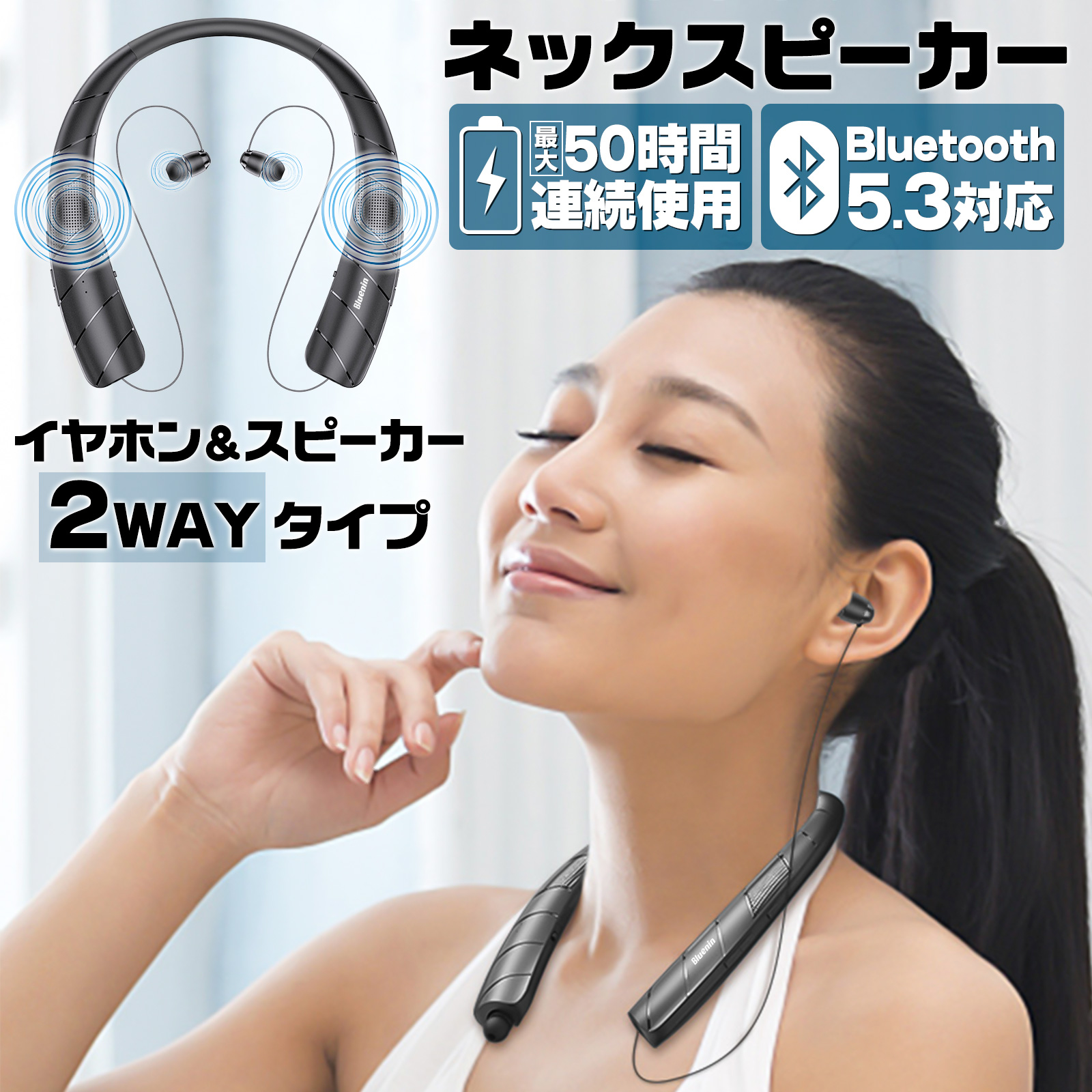 ネックスピーカー ワイヤレスイヤホン ウェアラブルスピーカー ネックイヤホン Bluetooth 5.3 ネックバンド 首かけ 肩かけ スピーカー ブルートゥース 50時間連続使用可能 おしゃれ 高音質 ヘッドセット テレビ ゲーム 音楽 3D音響 Type-c 軽量 低遅延 IPX5 防水 マイク内蔵 ハンズフリー 通話可能 ポータブルスピーカー i Phone Android プレゼント ギフト 【Bluetooth接続】 Bluetooth5.3接続で有線の煩わしさを解消! スマートフォンやタブレット等、Bluetooth5.3に対応した デバイスとペアリングして音楽・動画・通話を楽しめます。 【2WAY接続可能】 スイッチの切り替えでイヤホンからスピーカーに変更が可能! 【3D立体音響】 3Dサラサウンドスピーカーで臨場感のある音を体験! 【IPX5防水】 防水・防塵設計でアウトドアやランニング用にもお使いいただけます。 【通話可能】 ハンズフリー対応、マイク内蔵だから、装着したまま通話が可能! また、100gの軽量だから長時間