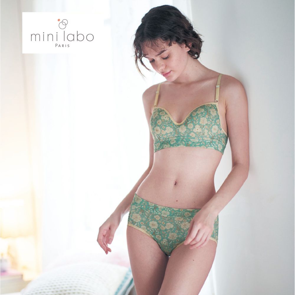 ーデザイン・スタイリングー・心地よさにこだわったブラ & ショーツ・大人の女性らしいボタニカルデザイン・マイクロゴムの配色がポイントー素材ー・やさしい綿混素材ー機能ー・ブラは下厚のカップでノンワイヤーながらもきれいな丸胸に・後ろホックは2列4段階調節ミニラボパリのデザイナーが生み出す大人かわいい世界「mini labo(ミニラボ)」は、パリで活躍する2人のクリエイター、キャロリーヌとセリーヌによるクリエイションブランド。パリの気分が詰まった、華やかで夢のあるミニラボワールドをつくりあげています。