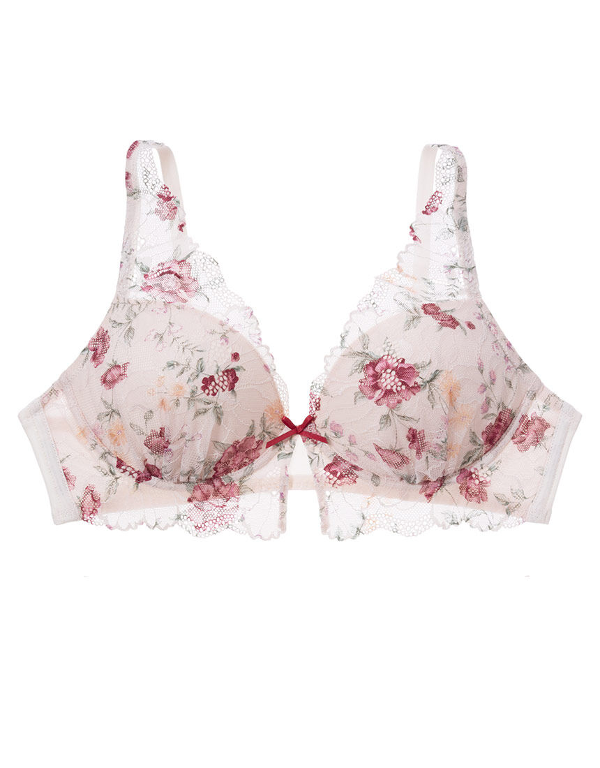 【おすすめポイント】・サイズに応じた厚みの下厚カップで、ちょうどいいボリュームのバストをメイク。・ラクな着け心地のノンワイヤーブラ。・カラフルなプリントレースをふんだんに使った、華やかで大人可愛いルックス。・おそろいのショーツと合わせても、うれしいお手頃プライス。【こんな人、こんな時に】・小胸をボリュームアップしたい・ワイヤー入りブラが苦手・レース使いのフェミニンなデザインが好き・普段使いのブラジャーを安くそろえたい【バストメイク・機能】・Bカップ、C65・70、D65はハリのある下厚カップでボリュームアップ。・C75、D70・75、Eカップはほんのり下厚のカップで、着太りしにくいシルエットに整える。・サイドベルトはパワーネット1枚。両サイドにボーン入りで、安定感を高める。・カップ肌側はポリエステル。【デザイン】・カラーによってそれぞれ雰囲気の異なる、花柄プリントのレースでカップをカバー・縦長のフルカップで、上部は素肌を透かしてほんのり色気あり・カップ下にもレースをやや長めにあしらい、中央にはスリットを入れてフェミニンなアクセント