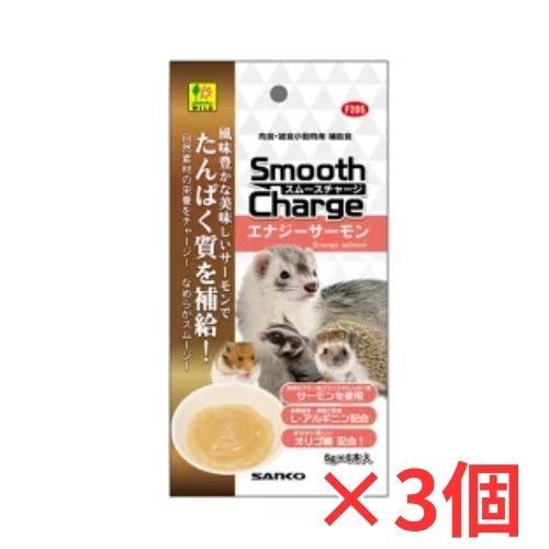 小動物用補助食 自然素材の栄養をチャージ!なめらかスムージー スムースチャージ エナジーサーモン×3個 内容量 6g×6本パック サーモンは、栄養価が高く、アミノ酸バランスの優れたたんぱく質が豊富で、体内での利用効率も高い素材です。 本品は風味豊かなサーモンを、滑らかな食感のペーストにした美味しい補助食です。 ・体調維持、健康に配慮してL-アルギニンを配合。 ・オリゴ糖を配合し、腸内環境維持に役立ちます 原産国:日本 対象生体 フェレット・ハリネズミ・フクロモモンガ・ハムスター・ファンシーラット等の小動物 原材料 サーモン、ヨーグルト(殺菌)、たん白加水分解物、魚介エキス、植物性油脂、ラクトスクロースシロップ(オリゴ糖)、増粘安定剤(加工澱粉、増粘多糖類)、L-アルギニン メーカー:三晃商会