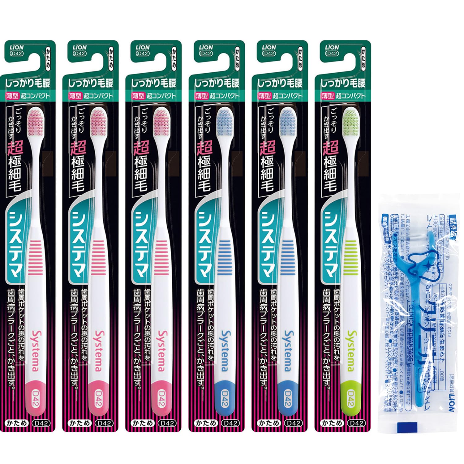 ◆商品名:システマ ハブラシ かため 超コンパクト しっかり毛腰タイプ 6本セット+ フロス付き 薄型ヘッド 超極細毛 歯ブラシ 歯周病 【.co.j