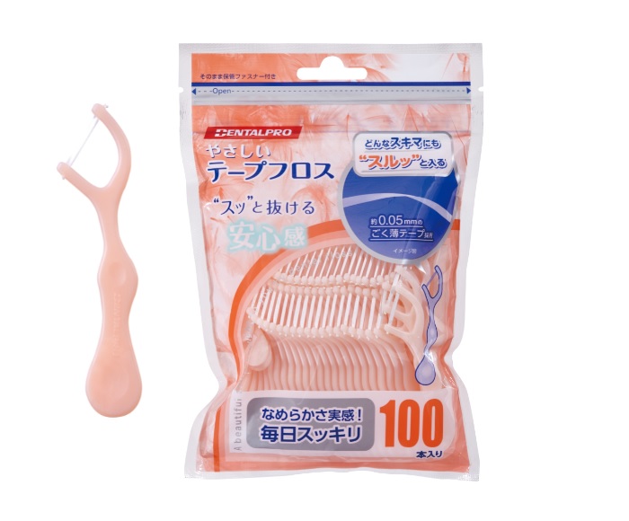 ●デンタルプロ やさしいテープフロス(デンタルフロス)●0.05mmのごく薄テープ採用、コンパクトなアーム設計。●コンパクトなアーム設計で、お口の小さなお子さまにも使いやすい。●2か所に「指先フィット加工」。●狭いスキマにもスルッとやさしく入りやすい約0.05mmの薄さ。●フロス部分に切れにくいPTFE素材を採用。薄いテープだから狭いスキマにもスムーズに入ります。