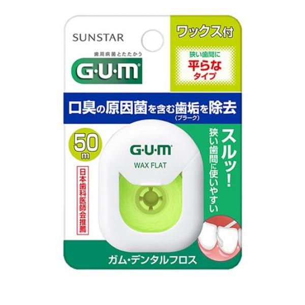 ●サンスター ガム・デンタルフロス ワックス付き ?平らなタイプ(SUNSTAR G・U・M WAX FLAT)●日本歯科医師会推薦。●平らなフロスで狭い歯間部にも挿入しやすいタイプです。●ワックス加工を施しているので、歯間部の狭い方でもスムーズに動かすことができます。●細いフィラメントを細かく編み込んだ形状で、歯と歯の間の歯周プラーク(歯垢)をしっかりとかき出します。●半透明のケースなので、フロス残量が一目で確認できます。●口臭と歯周病対策に。●ハブラシだけでは、じつは歯間部の歯周プラーク(歯垢)は61%しか取り除くことができません!いつものブラッシングにプラスして、フロスや歯間ブラシを使うことで、歯周プラーク(歯垢)を効果的に除去できます。