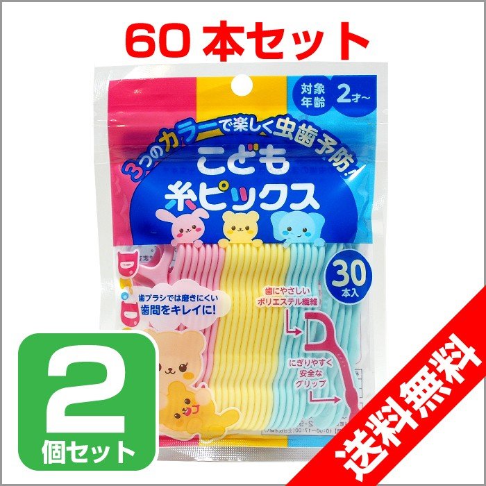 【対象年齢2才〜】3つのカラーで楽しく虫歯予防!お子様の虫歯のほとんどは歯と歯の間から出来ます。歯ブラシでは取りきれない細菌が残ったままで、歯が溶かされるためです。こども糸ピックスはお子様の小さなお口にも入りやすく、しっかり歯と歯の間の細菌を取り除いてくれます。虫歯予防のために、毎日こども糸ピックスを使いましょう。【使用方法】■お子横をひざの上に寝かして、明るい場所で目視しながら行います。■歯と歯の間にフロスを入れ、歯にそって前後に動かしながら上下させます。【材質】 柄の材質:ポリスチレン糸の材質:ポリエステル耐熱温度:70℃【内容量】30本(1袋あたり)【メール便で送料無料】■メール便配送の為、代引き不可■メール便配送の為、商品箱等のヘコミや破損が発生する場合がございます。予めご了承くださいませ。■メール便の為、出荷後の住所変更および住所不備による配達が発生する場合は費用が発生する場合ございます。