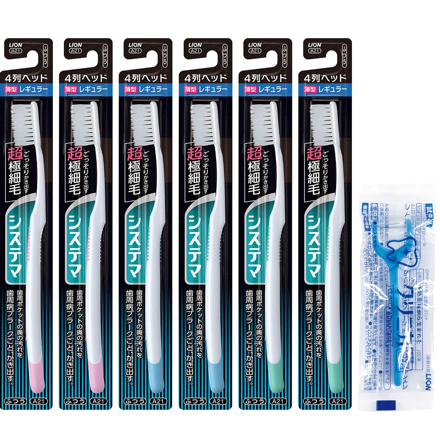 ◆商品名:【Amazon.co.jp限定】 システマハブラシ ふつう レギュラー4列 6本セット+ フロス付き 薄型ヘッド 超極細毛 歯ブラシ 歯周病