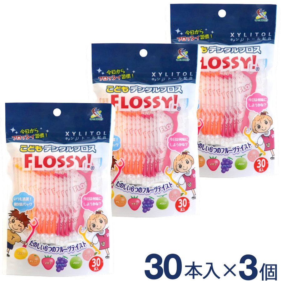 UFCサプライ こどもデンタルフロス FLOSSY 今日からフロッシィ習慣! たのしい6つのフルーツテイスト今日は何味にしようかな? ●保管に便利なファスナー付き。 ●細くて丈夫なポリエチレン製のフロスに6つの味が選べるくだものフレーバーとキシリトールをプラス。カラフルで楽しく、さらに"おいしく"お口のお手入れができます。 ●個包装パックでいつも清潔にお使いいただけます。 ●マンゴー、オレンジ、イチコ、ブドウ、メロン、ビーチ6つのフレーバーをカラーで分けています。 ●超極細のポリエチレン繊維を束ねた切れにくく丈夫なフロス(糸)。 ●お子様のお口に合わせたコンパクトサイズのアーチ。 ●安全にお使いいただける丸型グリップエンドの安心加工。