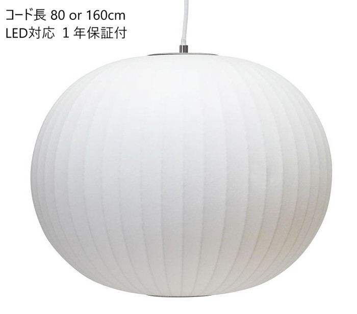 [サイズ]W43.5x H19 コード約160cm or 約80cmコード太さ 6mm※カップ内に収められるコードは約20cm程度(目安)となります。商品重量 約1キロシェード下部 リング内径 約9.5cm対応電球:E26 60W (LED電球対応)カップ天井側外寸 約9cmカップ天井側内寸 約8.5cmソケット部分厚み 約1.6cm[素材]シェード:ポリ酢酸ビニル(樹脂)フレーム:スチール ワイヤー[カラー]ホワイト[生産国]中国[商品説明]日本の住宅に合わせて短いコード(約80cm)の仕様をご用意いたしました。シェードの骨組みの本数は、48本です。オリジナルを出来る限り忠実に再現しました。ご要望がございましたので、シーリングソケット部分もホワイトに変更いたしました。カップ無しでダクトレールなどへの取り付けもよりスタイリッシュになりました。世界のミッドセンチュリーファンに50年たった今も圧倒的な人気を誇るジョージネルソンのバブルランプです。ぱっと目を引くフォルムをしたシェードの部分は軽量で丈夫なスチールワイヤーを使用し流れるような流線を描き、特殊な樹脂を吹き付けて完成させます。不織布の