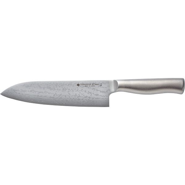 柳宗理のキッチンナイフのデザインはそのままに、刃に高品質なダマスカス鋼を使用した三徳包丁です。多くの工程が職人の手で作られているこだわりの逸品。 【商品サイズ】●全長約30.5cm・刃渡り約18cm【材質】●刀身=ダマスカス鋼(刃物用ステンレス鋼複合材37層・芯材VG10)、柄部=18−8ステンレス【原産国】日本【箱サイズ】36×8×3cm【箱入重量】290g【宅配区分】常温[ 包丁 ナイフ ]