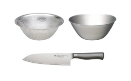 日本を代表するプロダクトデザイナー柳宗理がデザインした包丁です。長時間の使用でも疲れが少なくてすむよう、形状とともに重量バランスまで考慮して設計されています。キッチンナイフの刀身は芯材にモリブデンバナジウムを添加した特殊ステンレス鋼を使用し、粘り強い13クロームステンレスで挟み込んだ3層鋼です。切れ味・折れにくさ・さびにくさを併せ持ちます。同サイズのボウルとざるは組み合わせて使えます。ボウルはサラダの混ぜ合わせや、洗い桶にも使えるサイズ感です。ストレーナーは接地面が少なく水切りの良い形状です。ステンレス板にパンチング加工した素材で成型されており目詰まりしにくく洗いやすいのが特徴です。