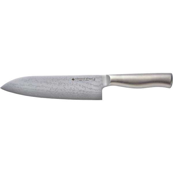 柳宗理のキッチンナイフのデザインはそのままに、刃に高品質なダマスカス鋼を使用した三徳包丁です。多くの工程が職人の手で作られているこだわりの逸品。 ●商品サイズ:現品全長約30.5cm・刃渡り約18cm●商品材料:刀身=ダマスカス鋼(刃物用ステンレス鋼複合材37層・芯材VG10)、柄部=18−8ステンレス●箱サイズ:36×8×3cm●箱込み重量:290g●包装種別区分:化粧箱入 ●11月下旬〜1月上旬にかけて:は繁忙期のためお時間を頂く場合がございます。