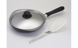 日本を代表するプロダクトデザイナー柳宗理がデザインしたフライパンとバタービーターのセットです。フライパンは表面に繊維状の凹凸をつけることで、食材と点で接して焦げ付きにくく、さらに窒化加工によりサビにくく扱いが簡単な製品になっています。フタを回転させると本体との隙間が調節できるので、蒸気抜きやソースの取り分けが簡単にできます。バタービーターのへらの分は薄く、しなる材料を使用しているので食材の下に差し込みやすくなっています。【取扱事業者:日本金属洋食器工業組合(日本洋食器 株式会社) TEL:0256-63-5121】