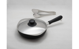 日本を代表するプロダクトデザイナー柳宗理がデザインしたフライパンとトングのセットです。フライパンは表面に南部鉄器のような凹凸をつけることで、食材と点で接して焦げ付きにくくなっています。フタを回転させると本体と隙間ができるので、蒸気抜きやソースの取り分けが簡単にできます。トングはにぎりやすく、食材をしっかりつかめる形状。洗いやすい一体成型です。穴によって余分な油を切りやすく、食材がずべりにくくなっています。グッドデザイン賞受賞。【取扱事業者:日本金属洋食器工業組合(日本洋食器 株式会社) TEL:0256-63-5121】
