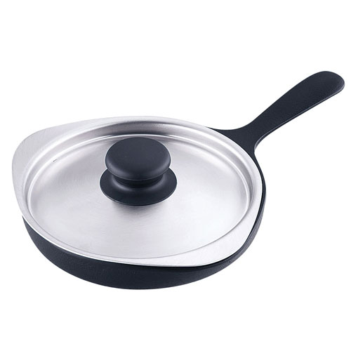 日本を代表するプロダクトデザイナー柳宗理がデザインしたフライパンとトングのセットです。フライパンは表面に南部鉄器のような凹凸をつけることで、食材と点で接して焦げ付きにくくなっています。フタを回転させると本体と隙間ができるので、蒸気抜きやソースの取り分けが簡単にできます。トングはにぎりやすく、食材をしっかりつかめる形状。洗いやすい一体成型です。穴によって余分な油を切りやすく、食材がずべりにくくなっています。グッドデザイン賞受賞。【取扱事業者:日本金属洋食器工業組合(日本洋食器 株式会社) TEL:0256-63-5121】