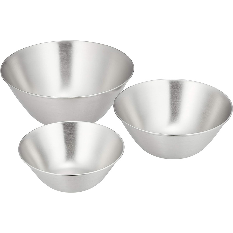 【商品の特徴】・18-8ステンレスを使用した丈夫で清潔なステンレスボール3点セット。(13・16・19cm)・料理の専門家や多くの家庭の主婦の意見に基づき、長年の研究を重ねてデザイン・そのまま食卓にあっても違和感のないシンプルなデザイン・表面は汚れやキズが目立たないつや消し仕上げ・収納性と優れた安定感で、使いやすさと美しさの両立【商品の仕様】生産国:日本サイズ:13 cm:φ132×H50 mm、16 cm:φ158×H65 mm、19 cm:φ185×H77 mm本体重量:13 cm:118 g、16 cm:169 g、19 cm:223 g材質:18-8ステンレス